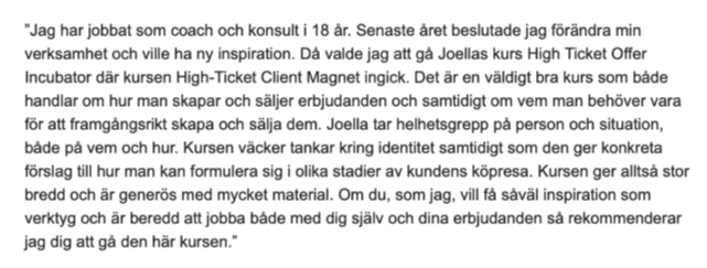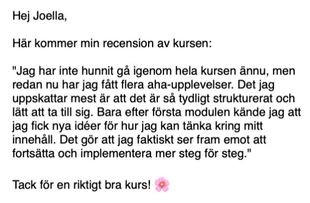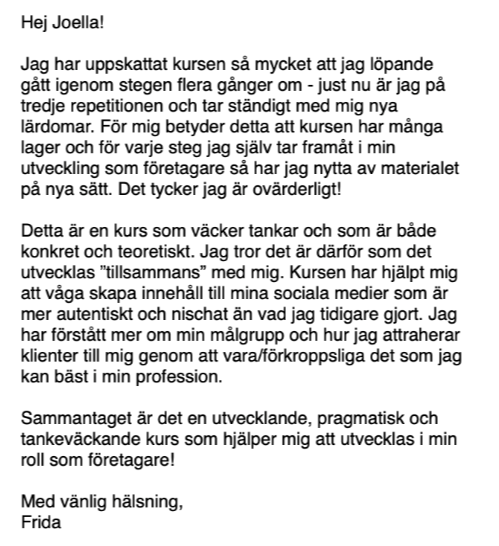 â Jag började attrahera kunder redan efter tvĂ„ veckor av konsekvent content. Jag kĂ€nner mig inte lĂ€ngre "fast". Joellas program gav mig klarhet. â